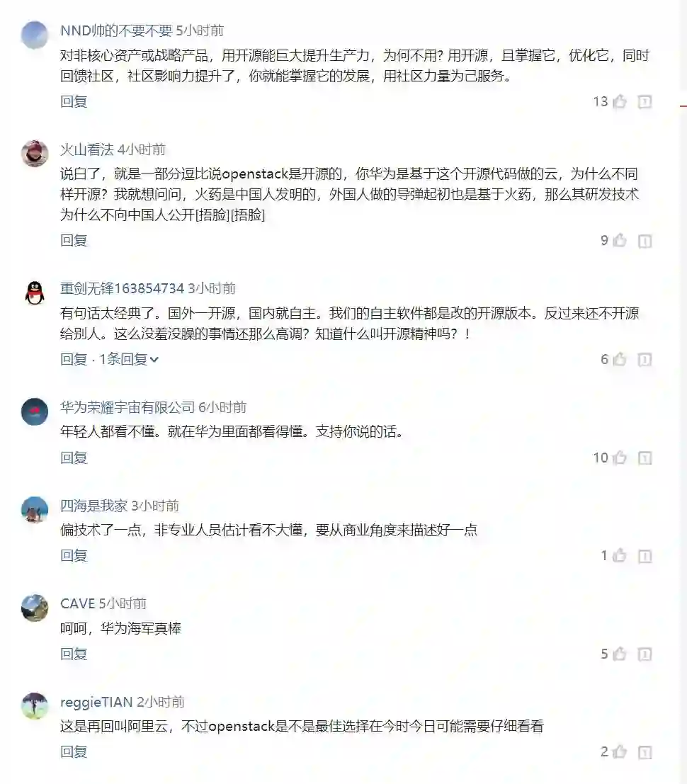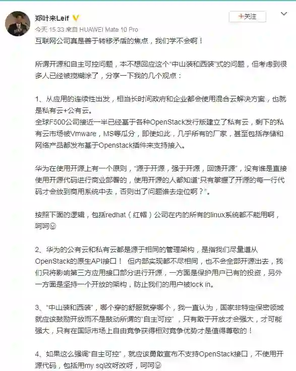 6 月 29 日,华为云总裁郑叶来在个人微博发文谈及云计算行业的开源和自主可控问题。他表示,国家非特定保密领域就应该鼓励开放而不是鼓动所谓的“自主可控”,“如果这么强调自主可控,就应该勇敢宣布不支持OpenStack接口,不使用开源代码。”