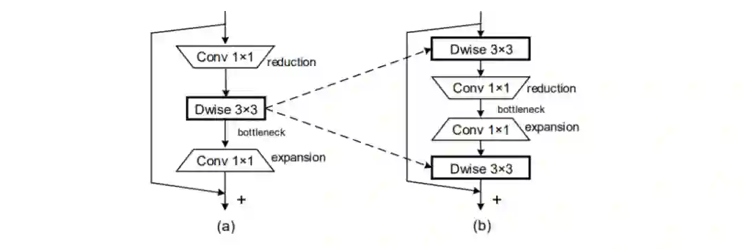 倒残差模块的深度卷积在两个1x1卷积之间,而1x1卷积会降低空域信息编码,因此依图团队将深度卷积置于两个1x1卷积之外(见图三b中的两个3x3深度卷积),这样就能确保深度卷积在高维空间得到处理并获得更丰富的特征表达。