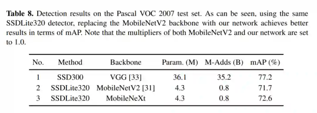 ,相比MobileNetV2, 使用MobileNeXt的基础架构,可带来0.9mAP的收益。