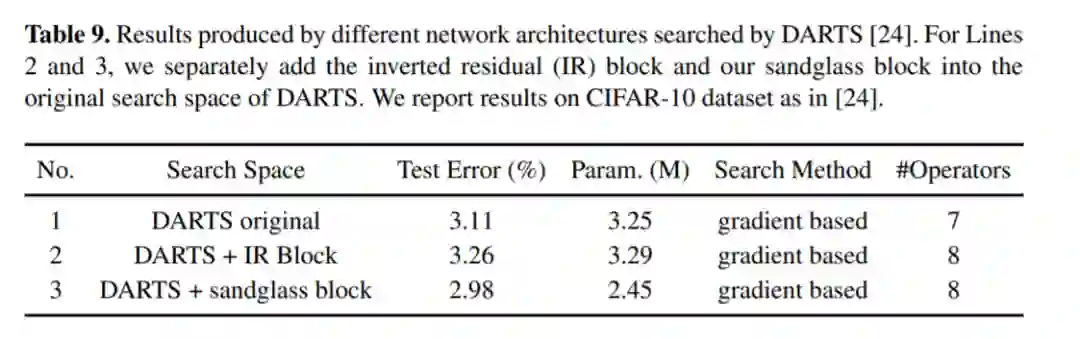 此外,新提出的沙漏模块可用于改良神经网络自动化搜索的搜索空间,在使用相同搜索算法的情况下,加入沙漏模块的搜索空间可以在CIFAR10的数据集上取得更高效的模型架构,大大优于谷歌的MobileNet、何恺明团队提出的ResNet等使用倒残差结构的模型