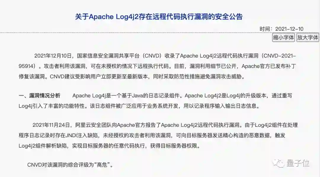 这个漏洞最早是由阿里员工发现。11月24日,阿里云安全团队向Apache报告了Apache Log4j2远程代码执行(RCE)漏洞。12月9日,更多利用细节被公开。