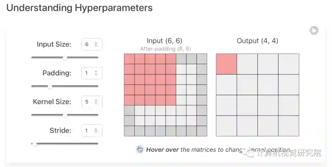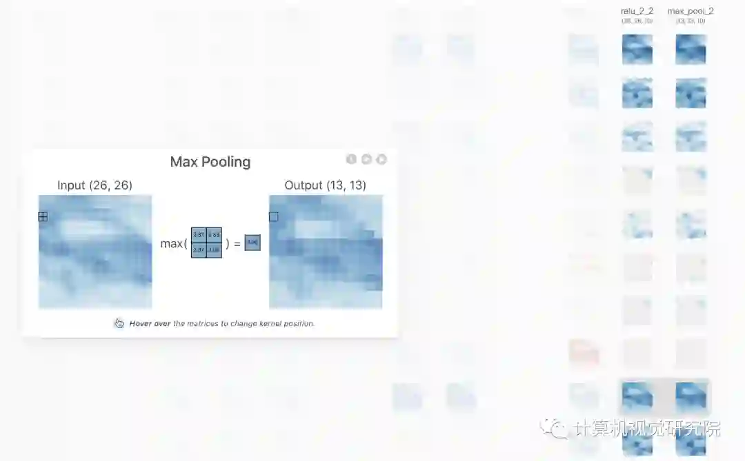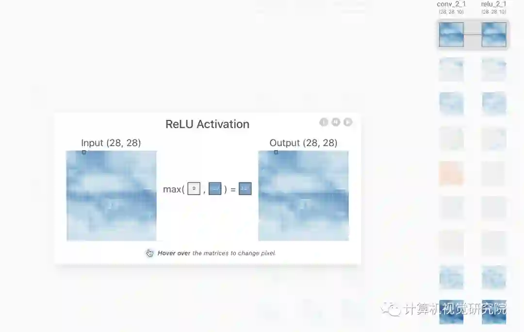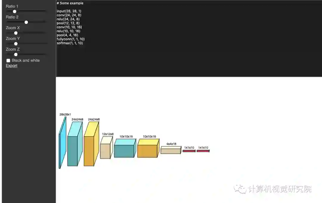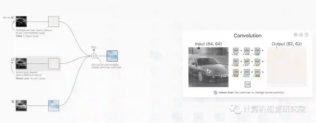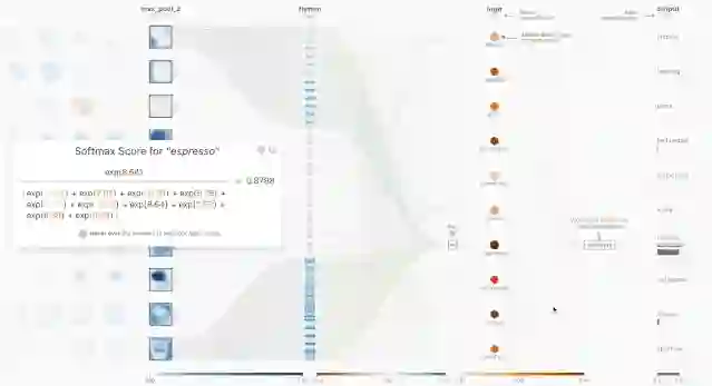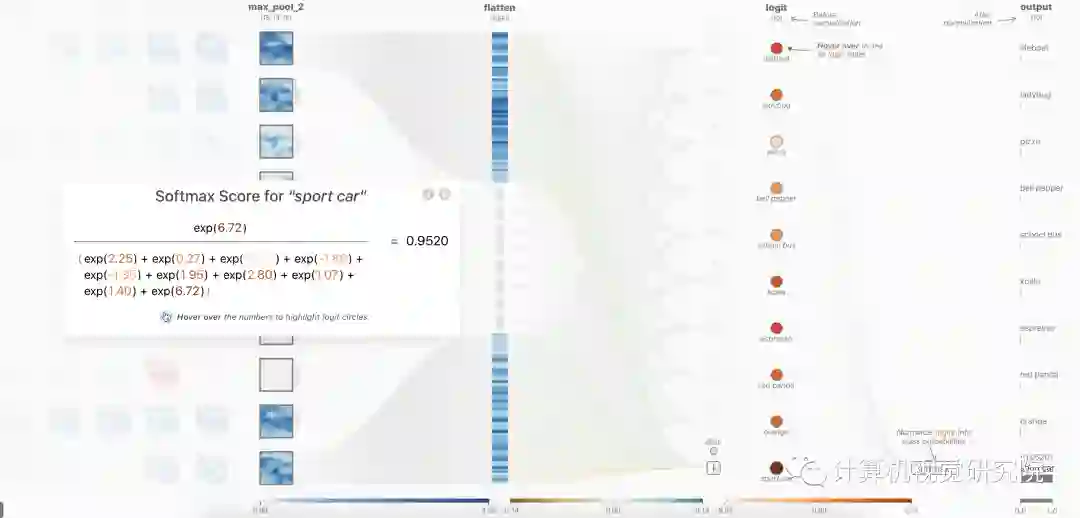 这个工具到底把 训练过程展示的多么详细?简单来说,项目作者已经给你做好了一个可以交互的界面,你只需要打开浏览器加载出这个界面就可以了。CNN Explainer 使用 TensorFlow.js 加载预训练模型进行可视化效果,交互方面则使用 Svelte 作为框架并使用 D3.js 进行可视化。最终的成品即使对于完全不懂的新手来说,也没有使用门槛。下面我们来看一下具体的效果。