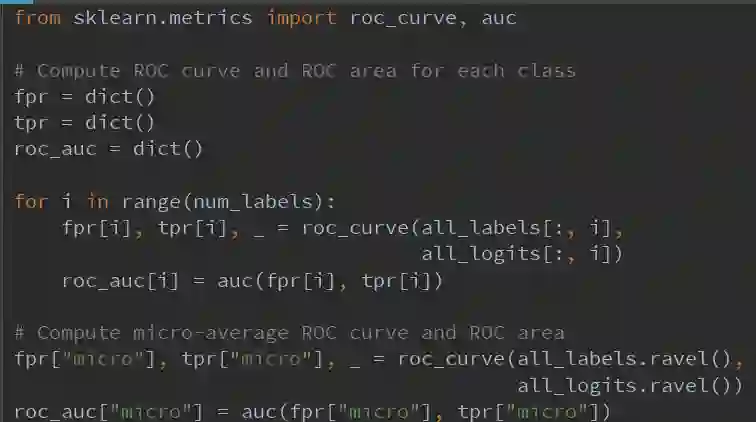 对于多标签分类,更重要的指标是ROC-AUC曲线。 这也是Kaggle比赛的评估指标。 我们分别计算每个标签的ROC-AUC。 我们还在个别标签的roc-auc分数上使用微观平均。