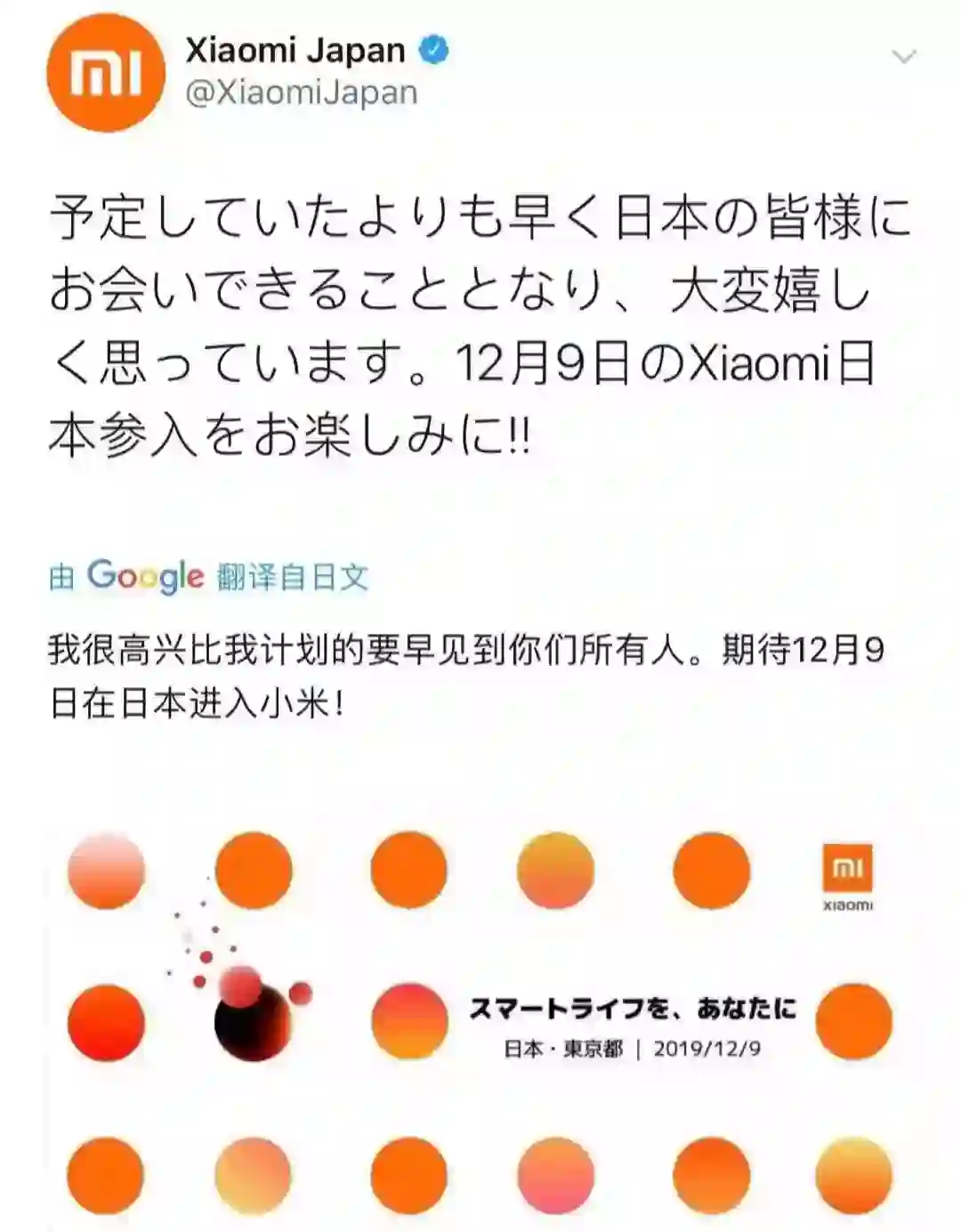 小米日本官方推特宣布,将于12月9日进入日本市场,并举行首场发布会。
