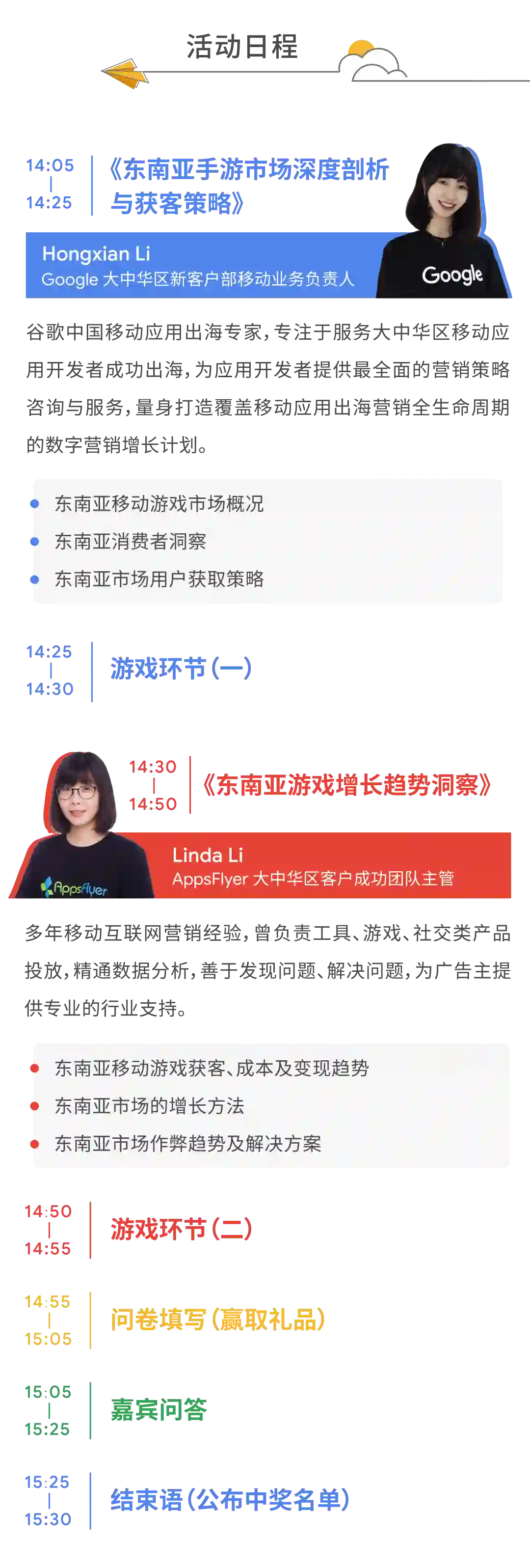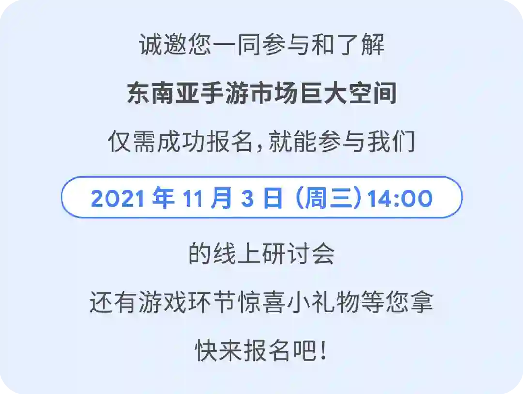Google 谷歌将携手 AppsFlyer 专家为大家带来精彩的线上直播分享:游戏出海的下一个金矿——抢滩东南亚,聚焦东南亚移动游戏市场概况、消费者洞察、用户获取策略及移动游戏获客、成本及变现趋势,为您答疑解惑,让您挖掘东南亚“金矿”。