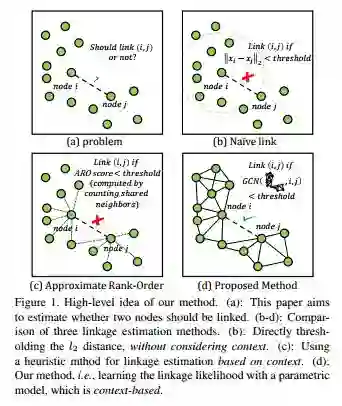 这种方法不需要依赖于一个全局的阈值如(a)或者人为设定的局部阈值如(c),可以让算法自己来观察当前的context,从而确定结果,这会使得linkage更加robust。