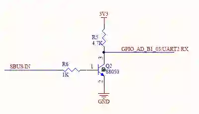 由于SBUS信号是一个反向电平的串口信号,这里使用一个三级管搭了一个简单的反向电路,从而将信号正确到接入到处理器的串口输入端。