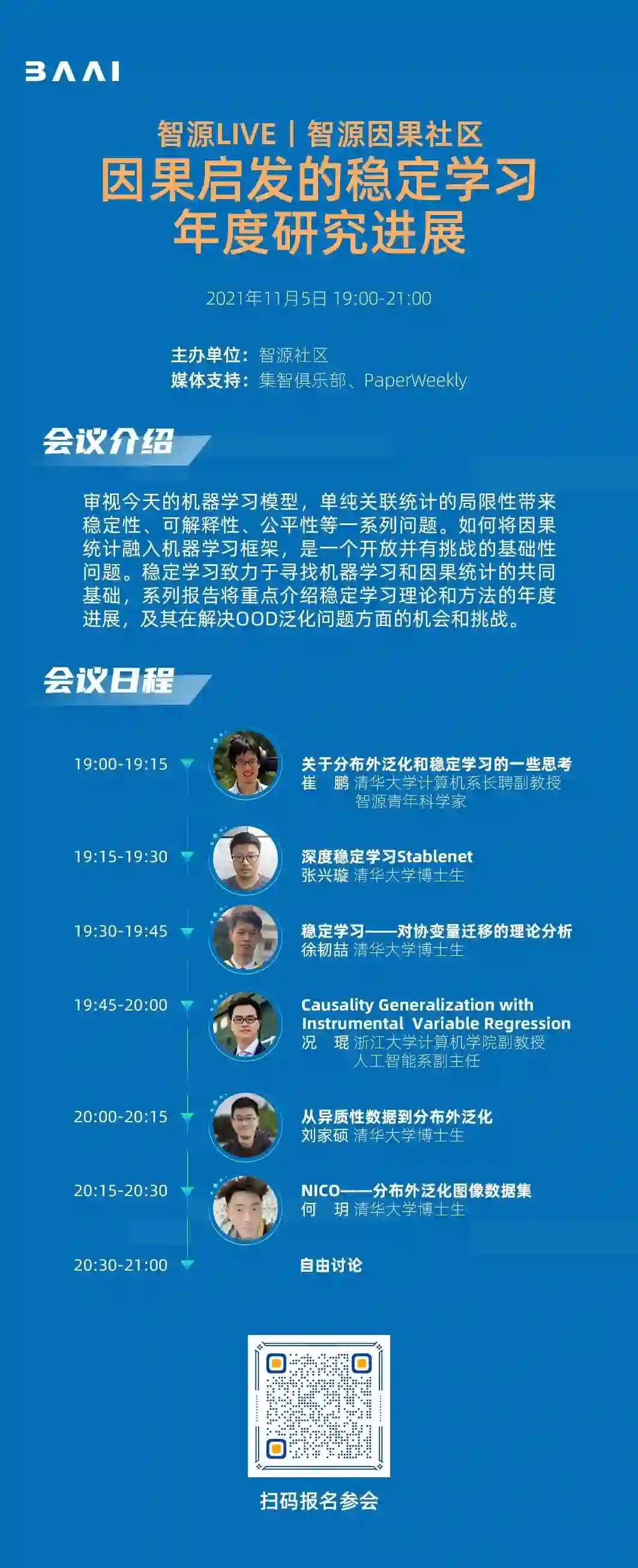 审视今天的机器学习模型,单纯关联统计的局限性带来稳定性、可解释性、公平性等一系列问题。如何将因果统计融入机器学习框架,是一个开放并有挑战的基础性问题。稳定学习致力于寻找机器学习和因果统计的共同基础,本次「智源LIVE丨智源因果社区:因果启发的稳定学习年度研究进展」系列报告由智源社区主办,于2021年11月5日19:00-21:00在智源社区线上召开,6位学者将重点介绍稳定学习理论和方法的年度进展,及其在解决OOD泛化问题方面的机会和挑战。感谢合作媒体“集智俱乐部”和“PaperWeekly”的支持。