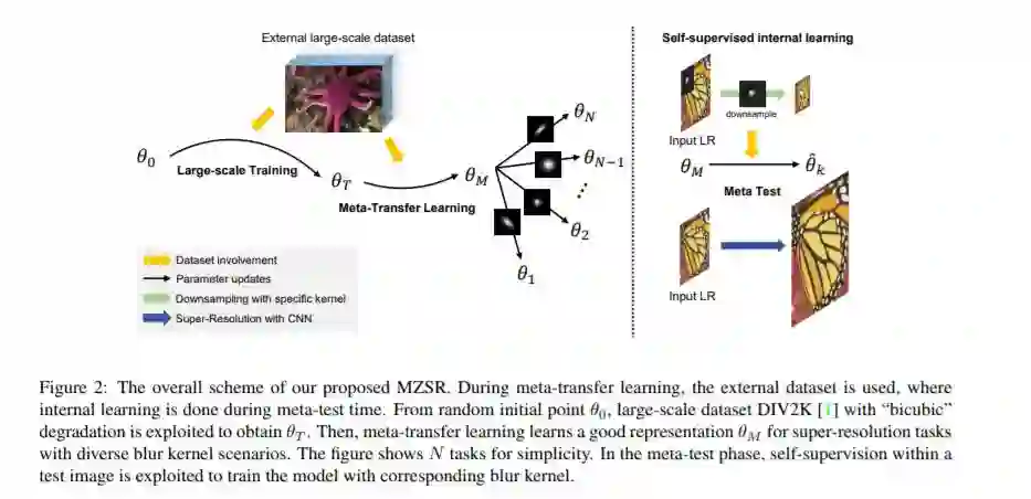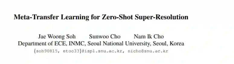 卷积神经网络(CNNs)通过使用大规模的外部样本,在单幅图像的超分辨率(SISR)方面有了显著的改善。尽管它们基于外部数据集的性能非常出色,但它们无法利用特定图像中的内部信息。另一个问题是,它们只适用于它们所监督的数据的特定条件。例如,低分辨率(LR)图像应该是从高分辨率(HR)图像向下采样的“双三次”无噪声图像。为了解决这两个问题,零样本超分辨率(ZSSR)被提出用于灵活的内部学习。然而,他们需要成千上万的梯度更新,即推理时间长。在这篇论文中,我们提出了一种利用零样本超分辨的元转移学习方法。准确地说,它是基于找到一个适合内部学习的通用初始参数。因此,我们可以利用外部和内部信息,其中一个梯度更新可以产生相当可观的结果。(见图1)。通过我们的方法,网络可以快速适应给定的图像条件。在这方面,我们的方法可以应用于一个快速适应过程中的一个大光谱的图像条件。