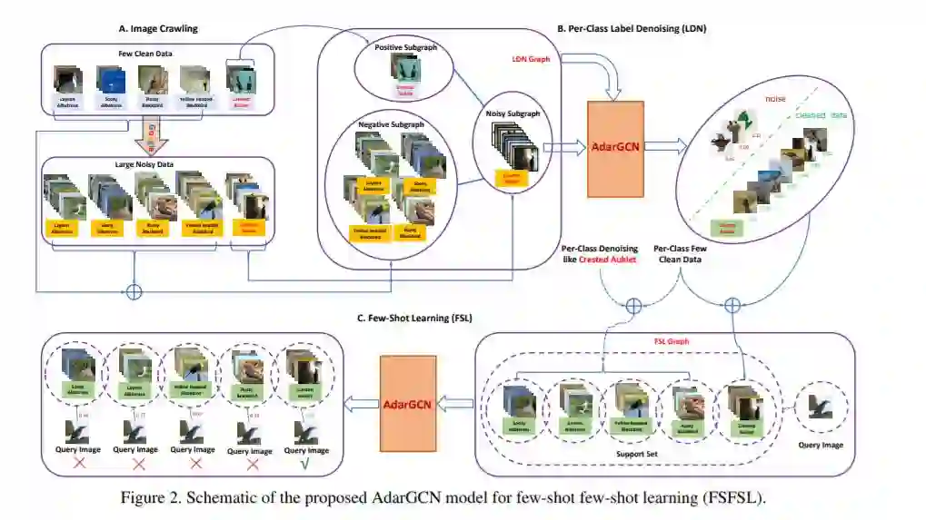 现有的小样本学习(FSL)方法假设源类中存在足够的训练样本,可以将知识转移到训练样本较少的目标类中。然而,这种假设通常是无效的,特别是在细粒度识别方面。在这项工作中,我们定义了一个新的FSL设置,称为few-shot fewshot learning (FSFSL),在这种情况下,源类和目标类都只有有限的训练样本。为了克服源类数据稀缺的问题,一个自然的选择是从web中抓取具有类名作为搜索关键字的图像。然而,爬行图像不可避免地会受到大量噪声(不相关的图像)的破坏,从而影响性能。针对这一问题,我们提出了一种基于GCN的图形卷积网络标签去噪(LDN)方法来去除不相关的图像。在此基础上,我们提出了一种基于gcn的清洁web图像和原始训练图像的FSL方法。针对LDN和FSL任务,提出了一种新的自适应聚合GCN (AdarGCN)模型。利用AdarGCN,可以自动确定每个图节点所携带的信息在图结构中传播了多少以及传播了多远,从而减轻了噪声和边缘训练样本的影响。大量的实验表明,我们的AdarGCN在新的FSFSL和传统的FSL设置下的优越性能。