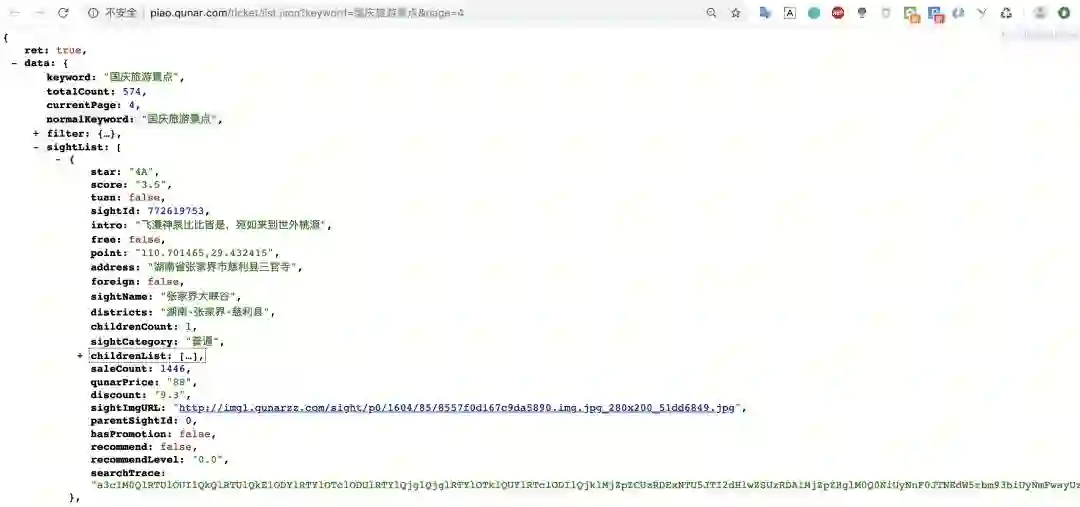 (http://piao.qunar.com/ticket/list.htm?keyword=)搜索:**国庆旅游景点**,就可以看到推荐的景点的一些信息,如:名称、地区、热度、销量、价格、等级、地理信息等等,信息应该说是比较全,良心!