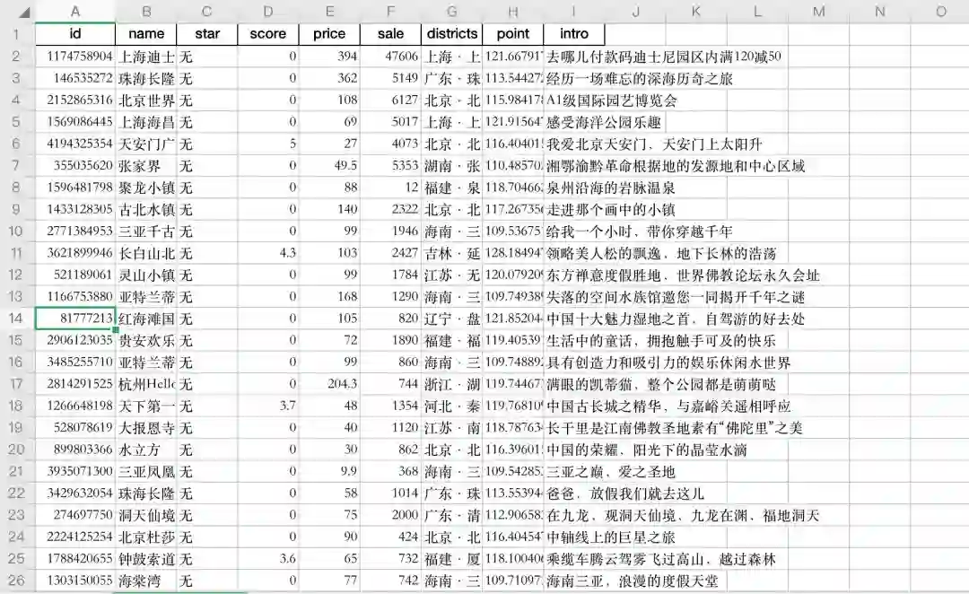 这里猪哥提取了:id、名称、星级、评分、门票价格、销量、地区、坐标、简介这些信息,基本有效信息都保存起来!