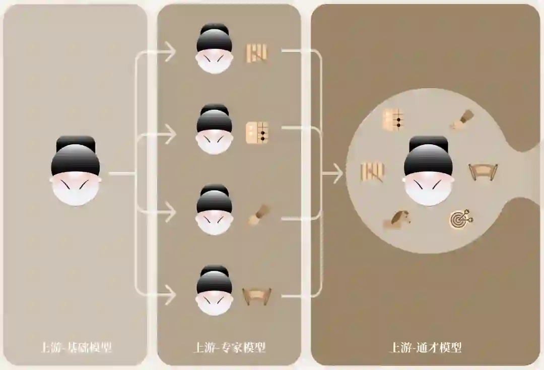 第二阶段,培养「专家能力」,即多个专家模型各自学习某一领域的专业知识,让每一个专家模型高度掌握该领域技能,成为专家;