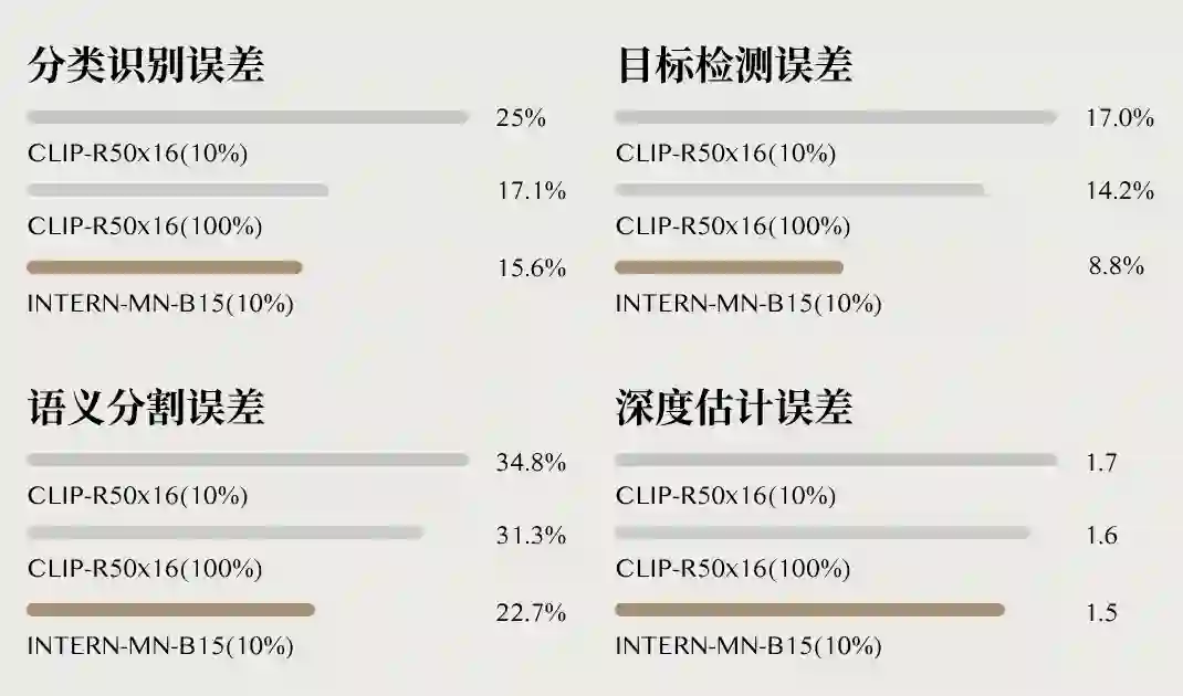 具体来讲,在分类识别、目标检测、语义分割及深度估计四大任务26个数据集上,「书生」的平均错误率分别降低了40.2%、47.3%、34.8%和9.4%。