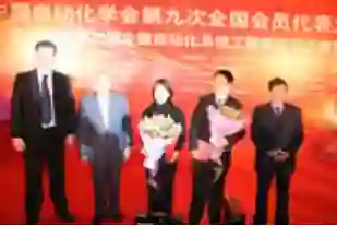 中国自动化学会原理事长戴汝为院士(左二)、孙优贤院士(右一)与ABB过程自动化业务北亚区兼中国区负责人柏轲先生(左一)给一等奖获奖作者北京市绿色煤电有限公司的郑松先生(右二)和金川集团公司的李瑞芳女士(左三)颁发奖品和证书