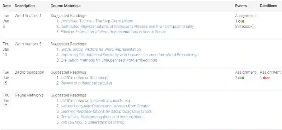 目前CS224n的2019年度课程表已经公布,授课时间从1月8日至3月14日,每周二和周四授课。其中1月份课程的建议阅读材料已经给出。