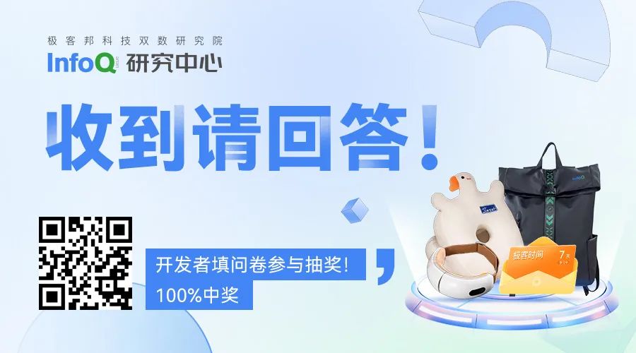 InfoQ 研究中心邀请正在看这篇文章的你,用填写问卷的方式,让我们可以更加深入了解当前开发者的现状,并且你也将获得一次 100% 中奖的抽奖机会。每一份问卷的提交,都会成为报告数据的有力支撑,帮助越来越多的开发人员不断学习,建立成长型思维,让开发者的能力与时俱进,为中国建设更好的开发者生态添砖加瓦!