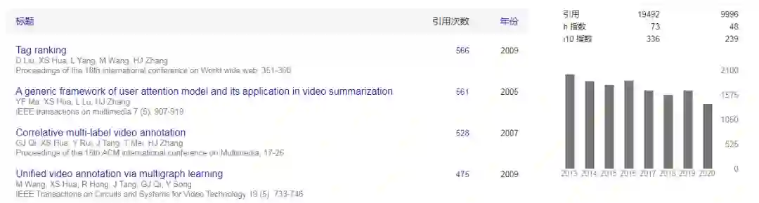 查看华先胜的Google Scholar页面,可以看到他引用最高的论文是Tag Ranking,“这个技术我很喜欢,但是应用上很难,因为适合的场景是社交媒体。”