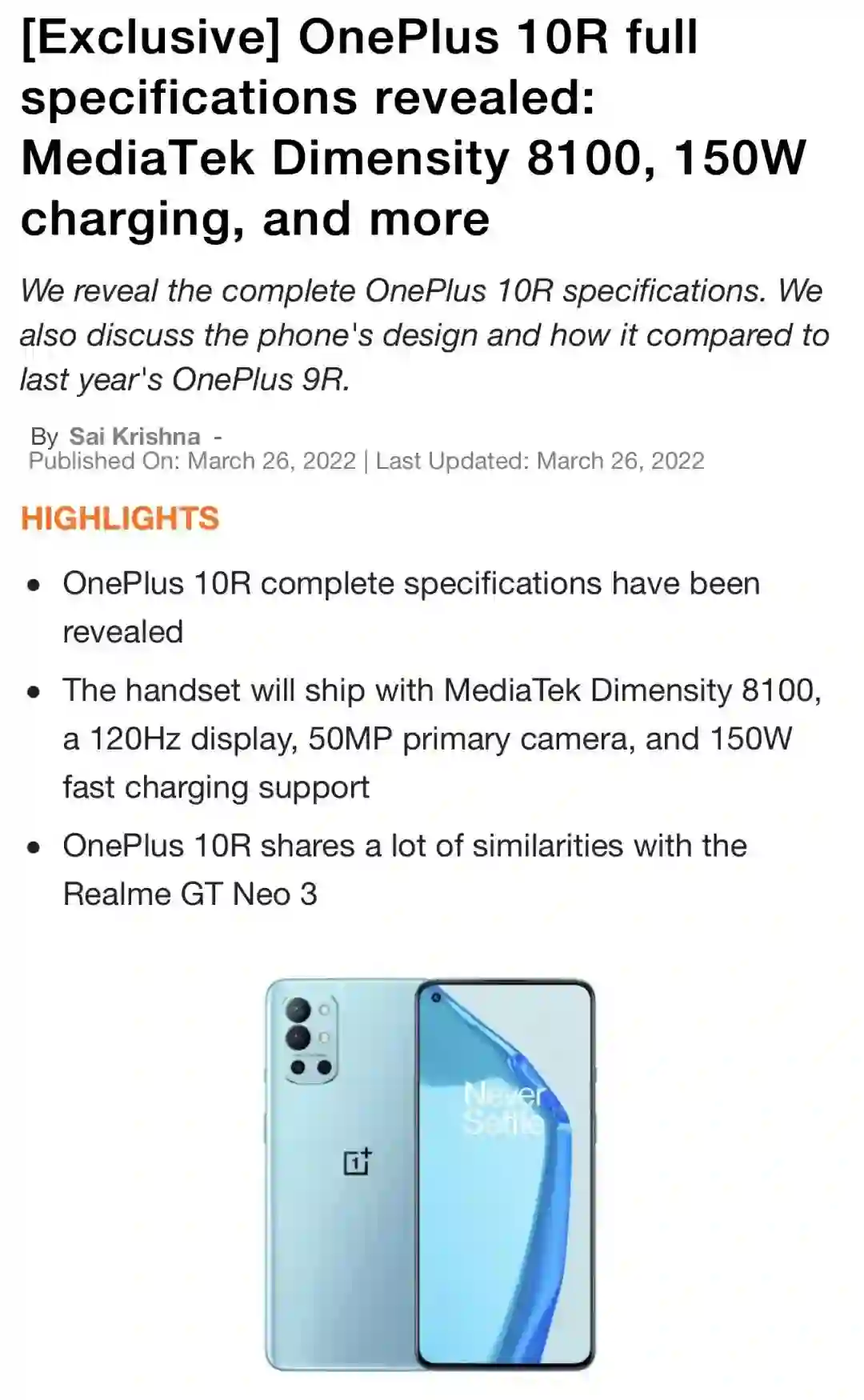 根据 Pricebaba 的一份报告,一加 10R 将是第一款配备中心位置打孔摄像头的一加手机。从历史上看,所有一加手机都有在左上角打孔以容纳相机模组。这款新机后置摄像头与 Realme GT Neo 3 非常类似,因此猜测一加 10R 是 Realme GT Neo 3 的改版,顶部有一个大的主传感器,底部有两个普通尺寸的镜头彼此相邻。
