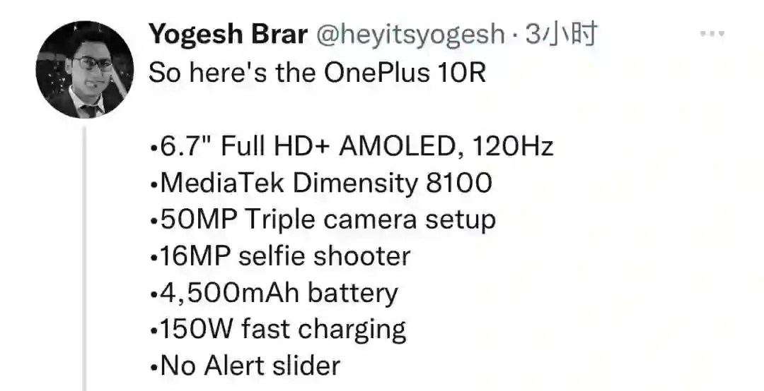 据 @Yogesh Brar 爆料,一加 10R 内部代号为"pickle"。该机将采用 6.7 英寸 FHD+ E4 AMOLED 显示屏,刷新率为 120Hz,支持 HDR10+。搭载联发科天玑 8100 芯片,搭配 8GB 或 12GB LPDDR5 内存,以及 128GB 或 256GB UFS 3.1 内置存储。