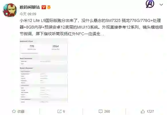 另外,据 @数码闲聊站 爆料,小米 12 Lite 不仅有骁龙 778G,还有骁龙 778G+ 版本,预装了 MIUI 13 系统,外观为小米 12 家族式设计。该手机还配备了屏下指纹、双扬声器、红外、NFC 等我们熟悉的硬件。值得一提的是,小米 Civi 产品经理胡馨心此前曾证实小米 12 青春版已经“没有”了,那么小米 12 Lite 或许不在国内发布,也可能会采用新的命名方式。
