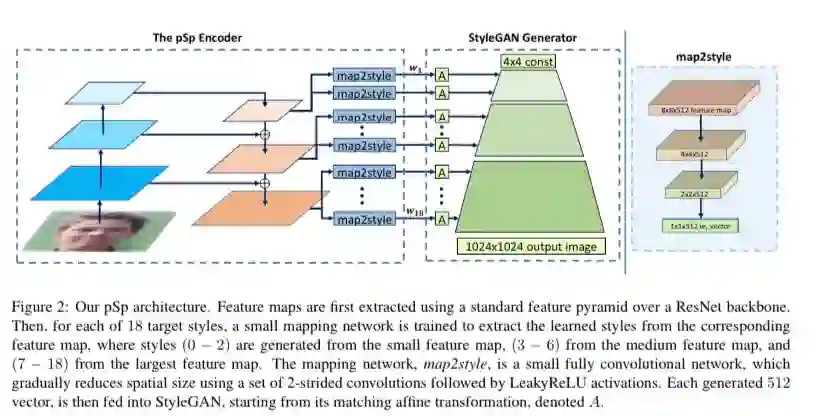 编码器基于特征金字塔网络「Feature Pyramid Network」,从不同的金字塔比例提取特征向量,并根据其空间比例将其直接插入固定的、经过预训练的StyleGAN生成器中。