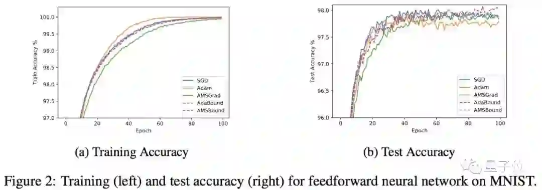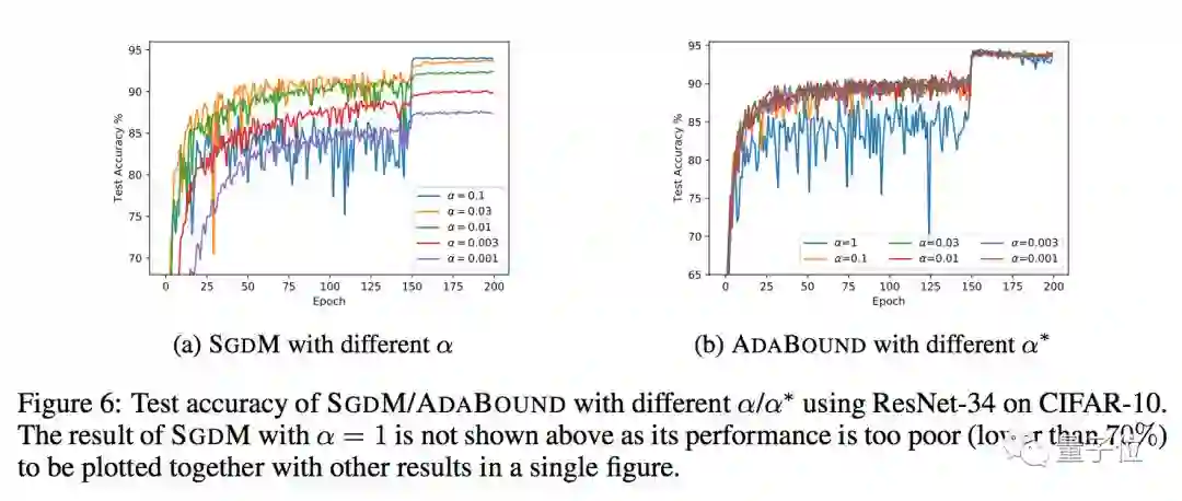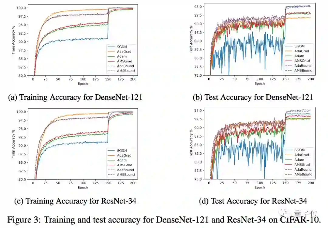 在这种情况下,AdaBound开始时就像Adam一样训练速度很快,随着学习率边界越来越受到限制,它又逐渐转变为SGD。
