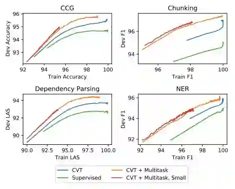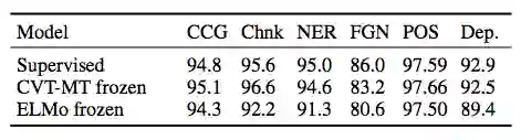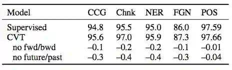 CVT 可用于多种任务和神经架构,但是本研究主要聚焦于序列建模任务,其预测模块与共享 Bi-LSTM 编码器关联。研究者提出对于序列标注器、基于图的依存句法分析器和序列到序列模型都很有效的辅助预测模块,并在英语依存句法分析、组合范畴语法(CCG)supertagging、命名实体识别、词性标注、文本语块识别(text chunking)和英语-越南语机器翻译任务上对该方法进行了评估。CVT 在所有这些任务上都改进了之前发布的结果。此外,CVT 还可以轻松高效地与多任务学习结合使用:只需在共享 Bi-LSTM 编码器上添加适合不同任务的额外预测模块。训练统一模型来联合执行所有任务(除了机器翻译)可以改善结果(优于多任务 ELMo 模型),同时降低总训练时间。