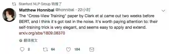 在 BERT 论文出现的几周前,斯坦福大学和谷歌大脑合作的一篇同样关于 NLP 预训练模型的论文发布。该研究提出一种新型自训练算法 Cross-View Training (CVT),结合预训练词向量和自训练算法,使用标注数据和无标注数据的混合,从而改善 Bi-LSTM 句子编码器的表征,进而改善整个模型。此外,CVT 与多任务学习结合起来后效果尤为显著。