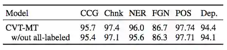 表 2:有/没有适用所有任务的标注数据时,多任务 CVT 的开发集性能。