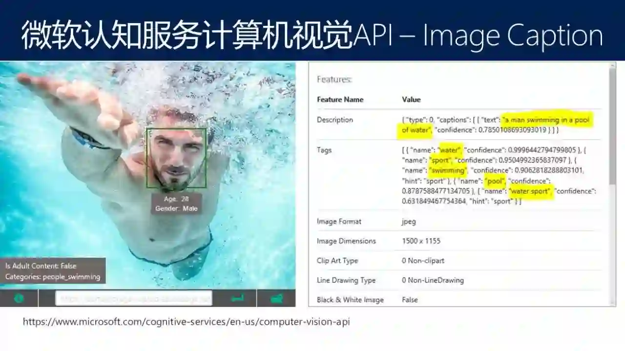 用两个具体的例子说明我们从感知到语言表述方面的进展。第一个就是微软认知服务里面的 Image Caption,计算机系统能够自动给图片生成标题。第二个就是微软应用软件 Seeing AI,系统可以自动生成照片画面内容的表述,包括画中人物的动作甚至是表情。大家如果有兴趣可以到微软的网页上了解项目详细信息,同时我们还有很多其他视觉的服务。