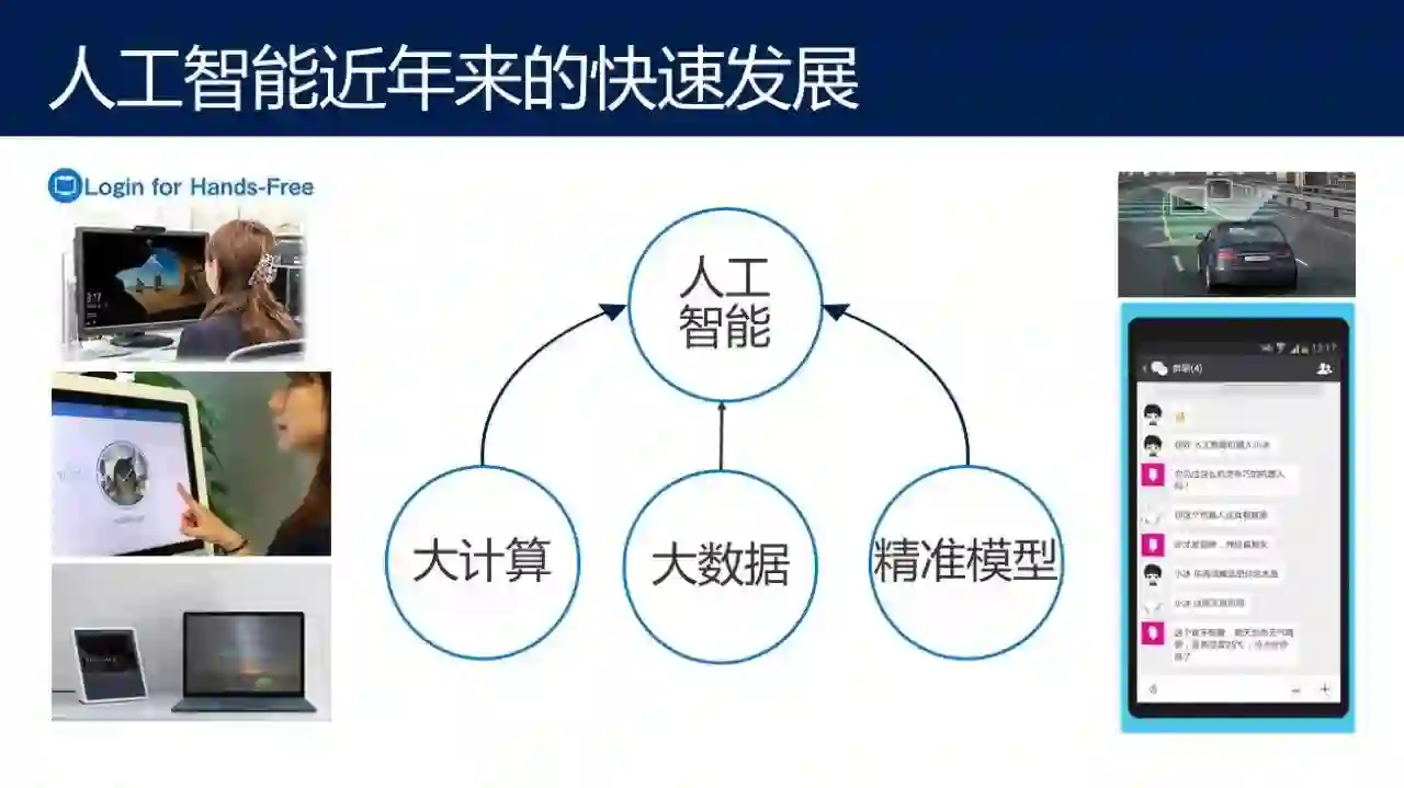 人工智能近年来的发展近乎神速,这主要是得益于“两大一精”的进步和突破:大计算、大数据、精准模型。人工智能其实是一个非常宽泛的概念,大致上我们可以把它分为两个研究方向,感知和认知。感知中的视觉和语言进展飞速,但认知中的语言理解发展速度有限。