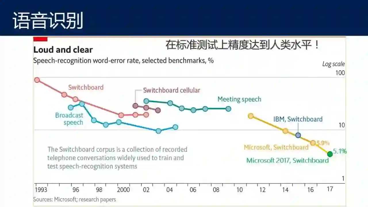 我们在感知研究方向已经取得了非常了不起的成果,其中一项就是语音识别。几个月前,在 Switchboard 标准测试数据集上,微软基于深度学习的语音识别系统的精度达到了创纪录的 5.1%,这是超过专业速记员的误差水平。尽管这项语音识别系统还存在一些应用场景的限制,但是我相信未来五年之内,机器将会完全超越人类的识别水平。