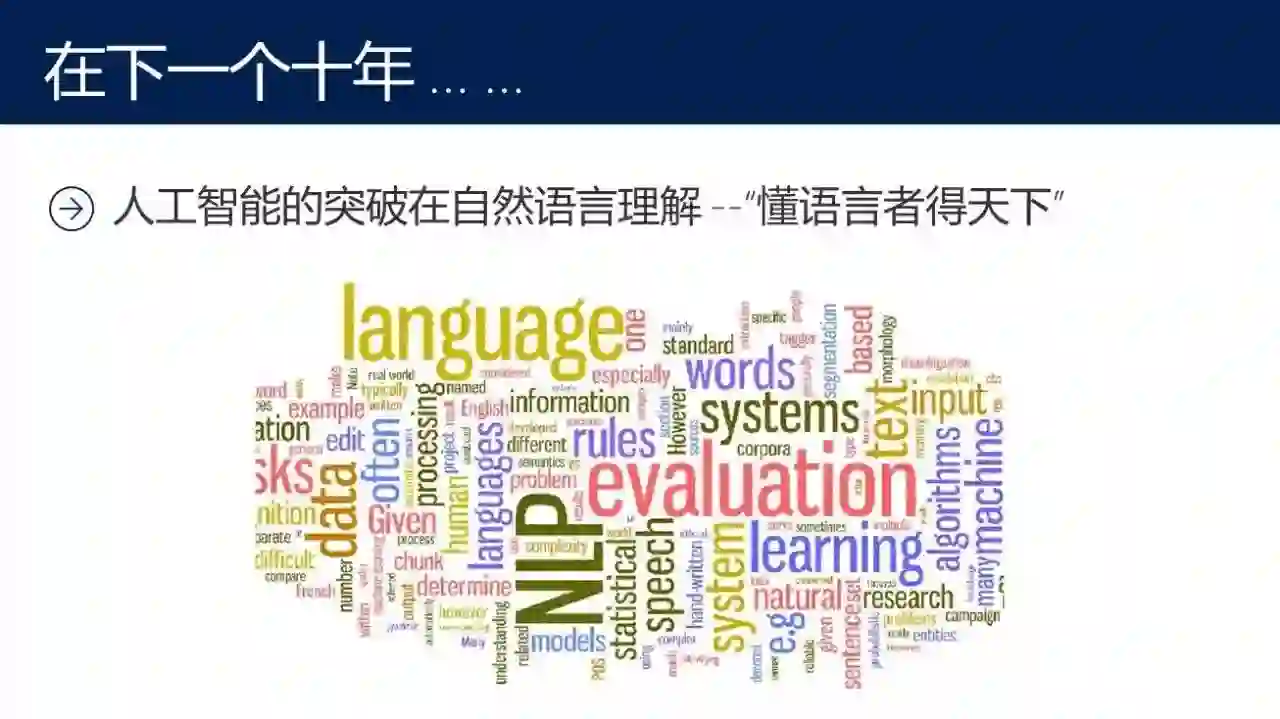 在下一个十年,人工智能的突破在自然语言的理解。懂语言者得天下,人工智能对人类影响最为深刻的就是自然语言方面。语言理解分为三个不同的层次:表述、对话、意境。表述在今天看来已经非常成功,用机器学习就可以学到很多东西;对话就涉及到机器智能领域,包括对话和提问,这相对会比较困难;机器意识是意境的体现,让机器在有意识思维基础上理解和表达诸如隐喻在内的意境的能力。