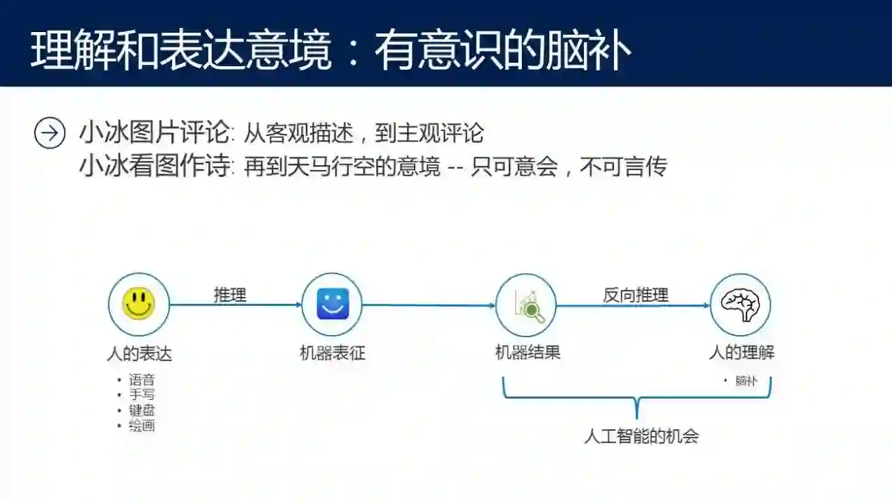 第三点我想分享一些比较新颖的东西,有关自然语言的意境。当我们从机器描述到机器对话,智能到底体现到哪里?图片可以理解和表达意境,能够实现有意识的脑补,以此和用户实现对话和交互。从客观描述到主观评论,再到天马行空的意境,就是只可意会,不可言传的境界。到现在为止,人工智能的研究是人做了一些东西,有一个表征,通过你的输入,机器把这些进来的信息做成机器的语言,再进行深度学习。今天绝大多数的人工智能的科研都是停留在这一步,真正有意义的对人类有贡献的,就是你要把结果反向推理。我们来看一下 Image Caption 的进步,它的表述和评论都充满了人情味。