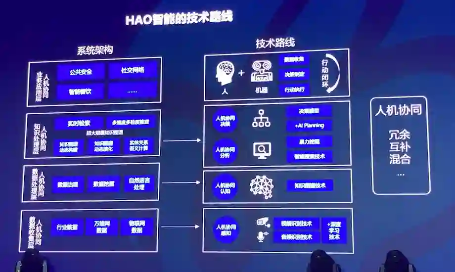 今年,明略科学院在北京、上海等地设置了5个本土实验室,“中间设置技术委员会,打通不同业务之间的技术需求。在每一项业务里, 技术搜集业务的需求,把科学院实验室的研究成果落地,产生实际的生产价值。”吴信东表示。下附HAO智能的技术路线。