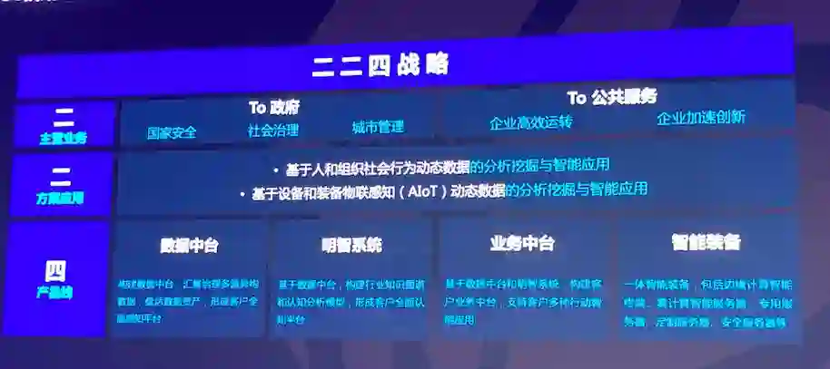 其次,立足中国,做全球业务。吴明辉认为中国市场是一个世界级的市场,但走向世界,打通中国市场是前提。如何落地?明略科技联席总裁郑农将其总结为“224”战略。“4”指的是四条产品线:数据中台、明智系统、业务中台、智能装备。