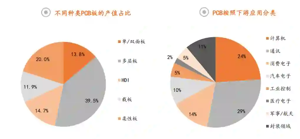 广义的PCB可以分为硬板和柔性板(FPC),硬板依照层数来分可分为单面板/双面板、多层板、HDI和载板,一般多层板多为4层或6层板,复杂的甚至可高达几十层。PCB作为“电子产品之母”,在产业链中起到了承上启下的作用,其下游应用领域十分广阔。计算机、通讯、消费电子、汽车电子规模占比分别为24%、29%、14%、10%。