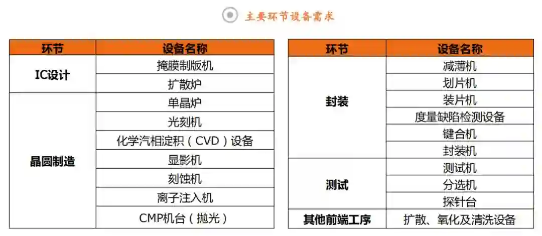 半导体集成电路制造过程极其复杂,需要用到的设备包括硅片制造设备、晶圆制造设备、封装设备和辅助设备等。晶圆制造设备中,光刻机、刻蚀机和薄膜沉积设备为核心设备,分别占晶圆制造环节的比例约30%、25%和25%。