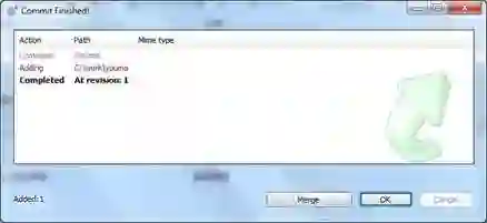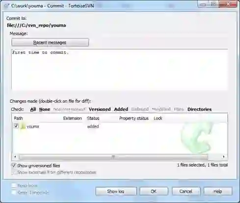 【步骤26】右击文件夹youma的图标,在快捷菜单选择SVN Commit。在对话框的说明栏输入说明文字,例如“First time to commit”,单击OK。