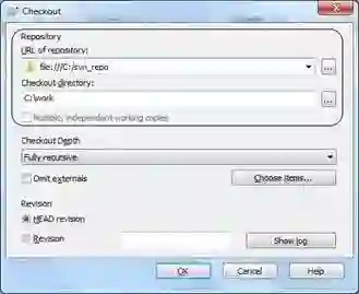 【步骤20】在对话框中设置URL of repository为file:///C:/svn_repo,设置Checkout directory为C:\work。单击OK。