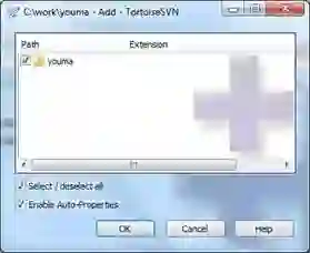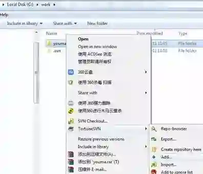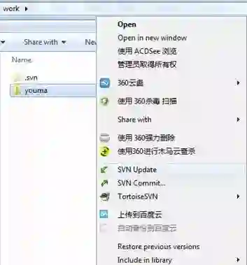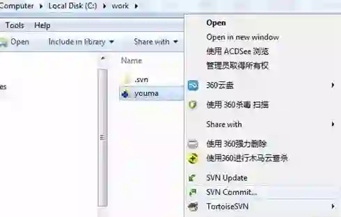 【步骤23】右击youma文件夹的图标,在快捷菜单选择TortoiseSVN|Add。