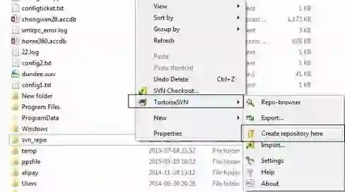 【步骤17】在C盘(其他盘也可以)创建文件夹svn_repo。在svn_repo文件夹图标上右击,在快捷菜单选择TortoiseSVN|Create repository here。
