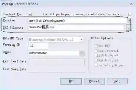【步骤31】勾选Control Package复选框,在version栏选择usr4,在XMI Filename栏把文件名改为愿景.xml,单击OK。