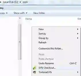 【步骤19】在C盘创建名为work的文件夹,右击work文件夹内的空白处,在快捷菜单选择SVN Checkout。