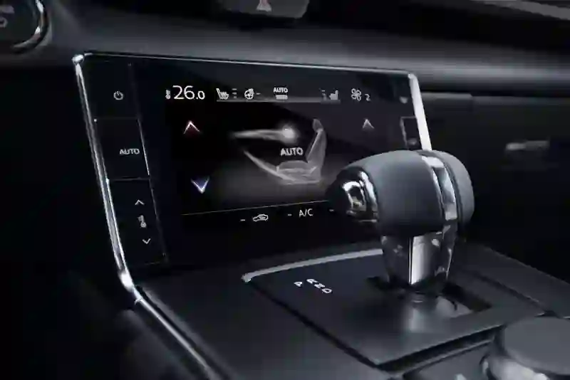 车内,MX-30 内饰采用了可回收再利用的纤维及环保材质,响应纯电动车的身份。三块屏幕分别是前方的仪表盘、右前方的车载系统以及档把前方的空调控制屏幕。