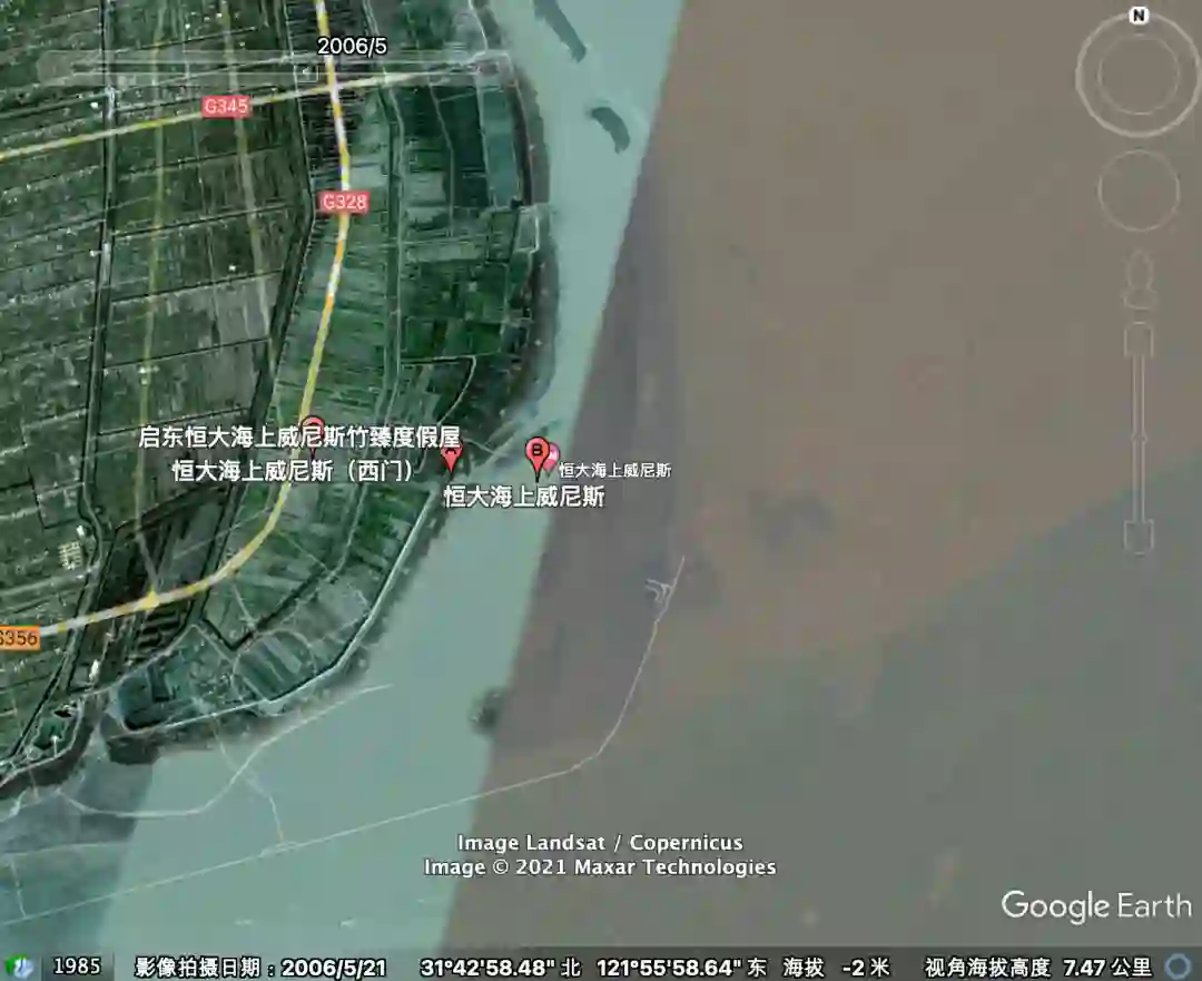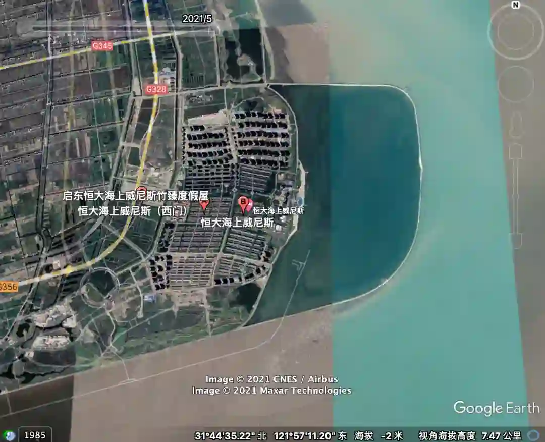 海上威尼斯占地8968亩,在2006年之前还是江苏启东的一片滨海区域,为了把长江入海口黄绿色的海水变蓝,恒大采用围堤筑坝的方式,围出7.2平方公里的海域,用来打造这个如同海市蜃楼般的超级项目。恒大在海上威尼斯规划了6万户,而七普期间,整个寅阳镇的常住人口刚过7万人。