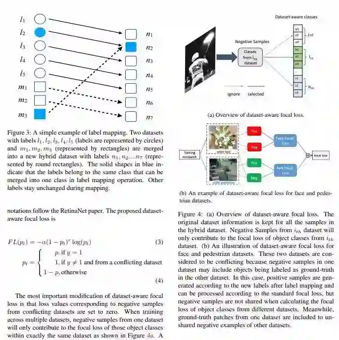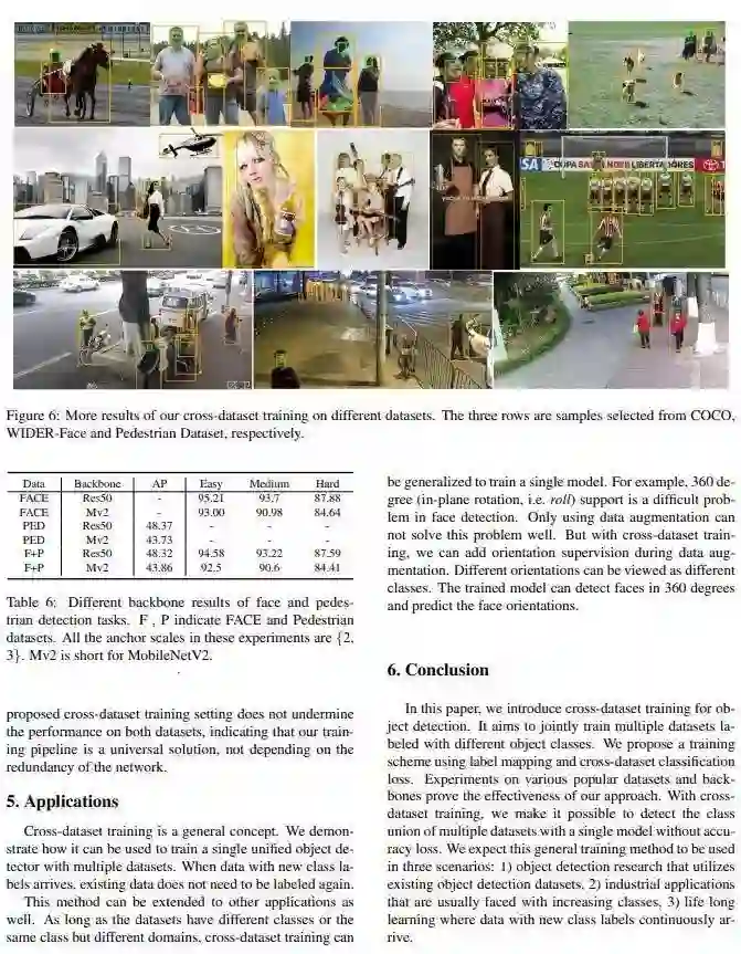 给定不同的数据集,跨数据集训练的目标是检测不同类别的并集,而不需要为所有数据集标记所有类别。通过这种方式,可以利用现有的数据集来训练模型,然后应用于合并之后的数据集,并且避免了在新数据集上进行标记。这篇论文在PASCAL VOC、 COCO、 WIDER FACE和WIDER Pedestrian这些数据集上实验了单数据集和跨数据集这两种训练模式。实验结果表明与独立训练相比,这篇论文提出的跨数据集训练框架可以同时在这些数据集上实现类似的性能表现。