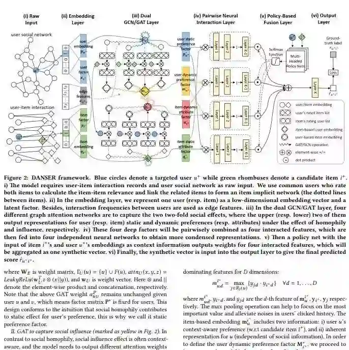 图神经网络已经取得了巨大的成功现在很多领域得到了应用。作为与图最相关的推荐,很多工作也尝试引入GNN来更好的学习节点表示。本文算是比较早的引入GNN来进行推荐的论文,发表在WWW2019上。作者探索了社交影响中在user-item二部图上影响,总共定义了4种社交影响,在通过GNN学习到表示之后,作者利用了强化学习技术来实现动态融合。实验结果验证了本文算法的有效性。