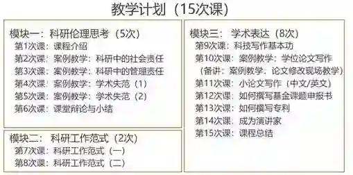 作为研究生素养教育课,课程内容设置分为科研伦理思考、科研工作范式和学术表达等三个模块,共64学时。每个模块包含一定数量的案例分析和课堂讨论,并通过两个大作业进行阶段性总结和展示。